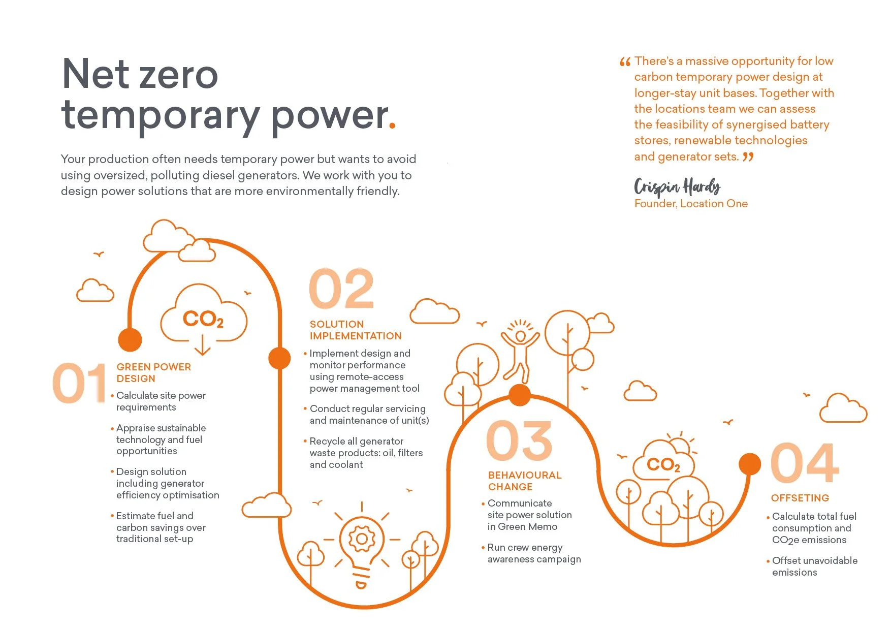 Location One is a UK-based company supporting film and TV production teams with the essential equipment and services needed for shoots on location and in studios. They were looking for a refreshed look and feel that retained their established brand elements — the orange and grey colour palette and the distinctive ‘1’ roundel. We took a clean, modern, typographic approach to evolve the brand while keeping it instantly recognisable.