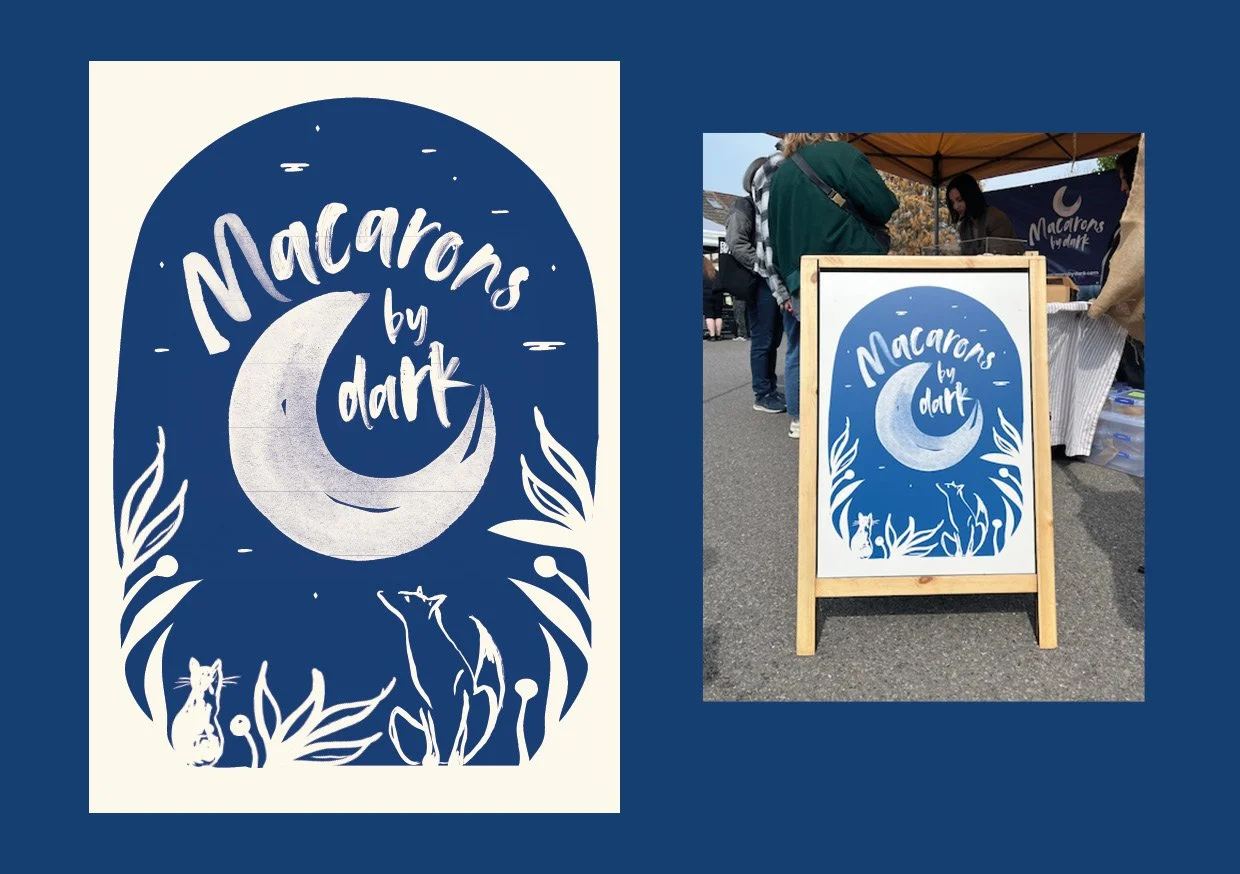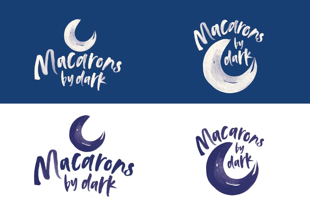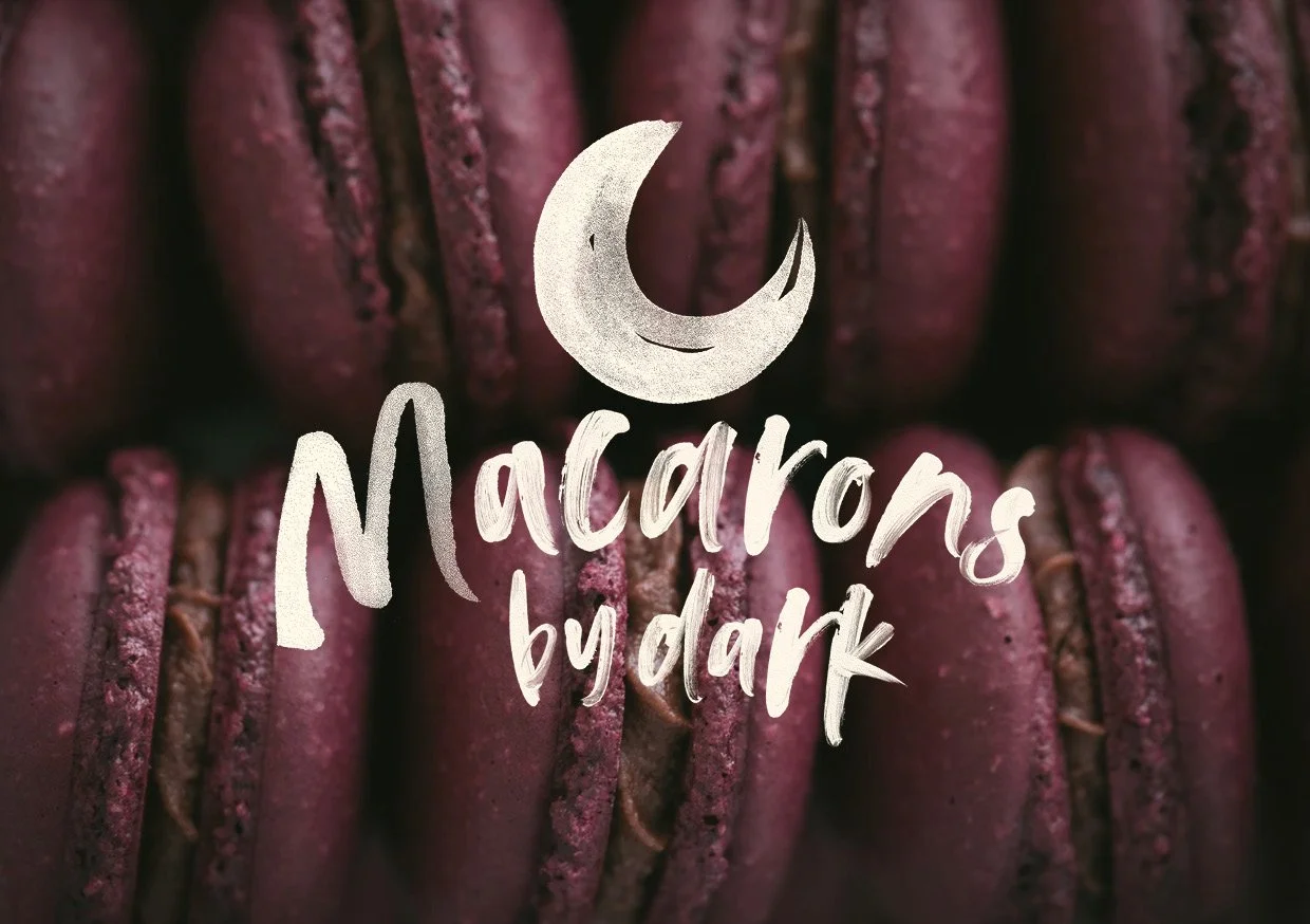 Macaron by Dark is a small, artisan macaron business run by a single maker. The brand needed to feel truly handmade, capturing the care, skill and love poured into every macaron. Much of the baking happens in the quiet hours of the evening, once her young children are asleep — giving rise to the name Macaron by Dark.
